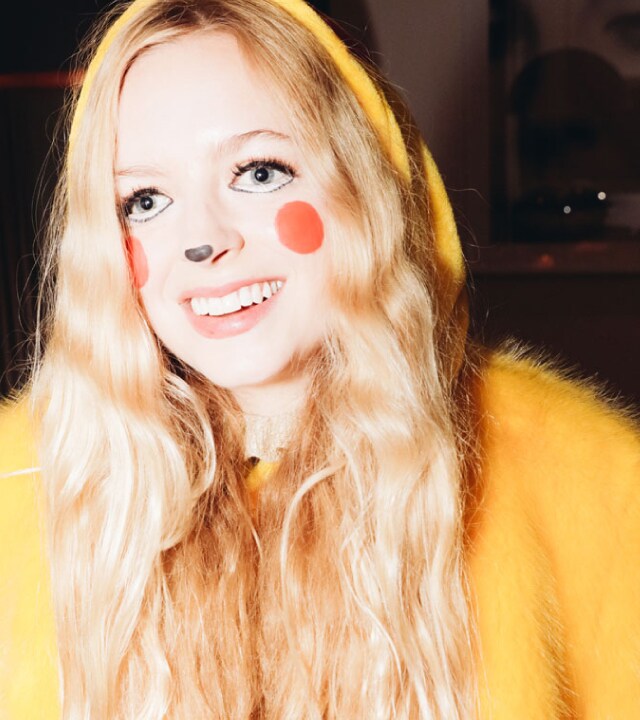 “I’m Pikachu! I wanted to wear something that would go with my faux-fur fluffy coats, and I love my yellow ones from SS15. I’m wearing a Pikachu fleece onesie, yellow fluffy Shrimps x Sophia Webster shoes and a fluffy, yellow Shrimps coat. I have little ears on my hood but it takes a little while for my hair to get out of the way to put my hood up. I’m blonde as well, so everything is blonde, gold and yellow – happy colours! They wanted my face to go yellow too, but I said sorry – I’m not in The Simpsons!”